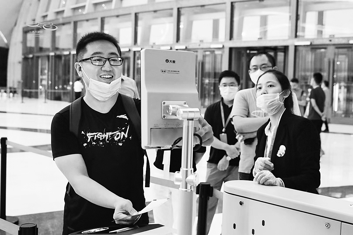 进场十分顺利,只花了几分钟。咪咪说:“入场很快,进门排队就两三个人,进音乐厅排队也就五六个人。等以后全面复演和商演重启的时候,江苏大剧院5个厅全开,人流量就大了,入场就没这么快了。不过,那个时候,疫情应该也过去了。”
