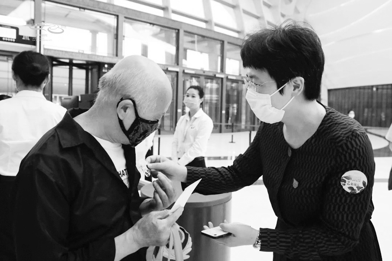 江苏大剧院党总支书记、执行董事诸敏首演当天为观众贴上小胸标。