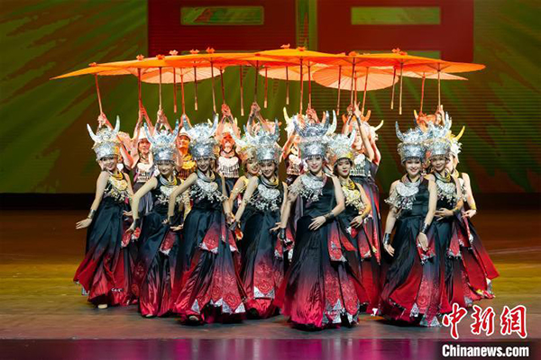 剧中的群舞精彩纷呈,女子群舞《苗女出嫁》中,苗族姑娘头戴银冠、身披银落、高举红伞踏步摆臂款款起舞,有如天边一片红云浮动美丽无穷。群舞《抗洪舞》,更以拟人化、意象化的手法作表达,既是洪水泛滥的四处狂泻,也是工人们的奋力抗争。