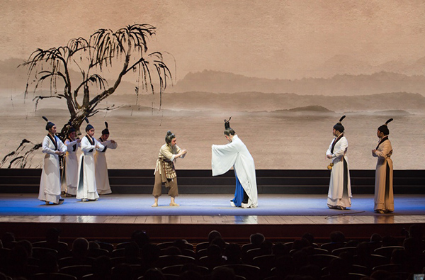 第三,是将两项非物质文化遗产融入到小戏中,凸现地域特色,增强了可看性与趣味性。越剧作为首批国家级非物质文化遗产项目,是诞生于浙江绍兴嵊州市施家岙的我国第二大剧种,又被称为“流传最广的地方剧种”,其优美动听的声音,真切动人的表演,蕴含江南的灵秀之气,为此,越剧常以表现才子佳人的故事类型为主。《子在渡口曰》却将视线投注到中国古代最重要的思想家、教育家孔子身上,创造性地将正统的儒家文化题材用越剧形式来表现,让越剧明快清新的艺术特色与儒家思想深厚的内在力量碰撞融合,在充满戏剧性的故事演绎中将孔子塑造成一个亲切、幽默、平易近人的老者,不仅将儒家思想阐释为通俗易懂的为人处世之道,还通过接地气的对白拉近相隔两千多年的时空距离。在舞台表现上,该剧充分体现了戏曲的虚拟性特色,将儒家思想的表达自然地融入进越剧的唱念做表中,使彼此相得益彰。可以说,这是一场富有探索性的创作,一方面拓宽了越剧题材的选择范围,丰富了越剧作为较年轻的江南地方剧种的艺术品格;另一方面也为儒家文化与戏曲文化互为平台、共谋传承发展提供了新的可能性。
