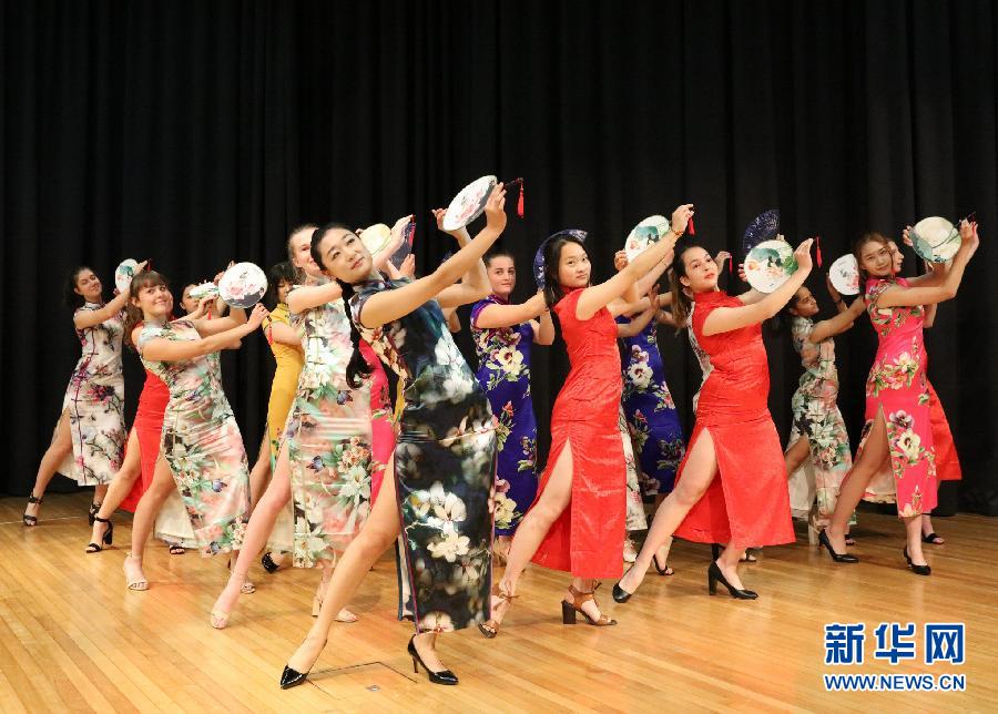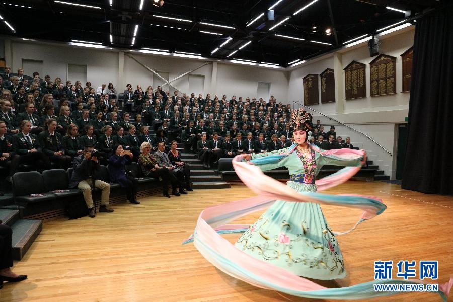 “2017年中国文化周”走进新西兰校园 5月8日,在新西兰惠灵顿,黑龙江省京剧院演员在塞缪尔·马斯丹女校表演京剧水袖。由新西兰中国文化中心、黑龙江省文化厅举办的“2017年中国文化周”活动8日走进新西兰校园,中国京剧演员与惠灵顿塞缪尔·马斯丹女校学生同台表演。新华社发(孟韬摄)