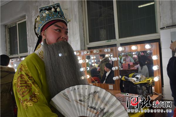 1月29日晚,由沙河市豫剧团表演的豫剧《抬花轿》在河北省话剧院儿童剧场上演。图为演出前演员在加紧化妆、排练。