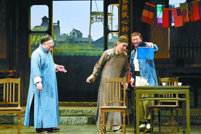 新版《茶馆》中,常四爷(右一)向松二爷、王利发(左一)展示自己养的鸟儿。李春光摄