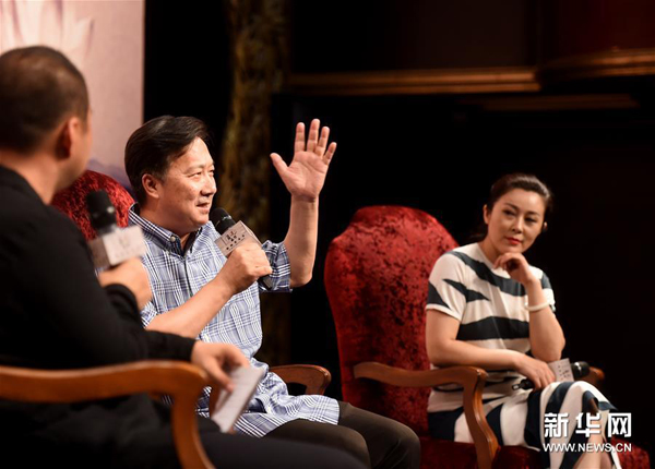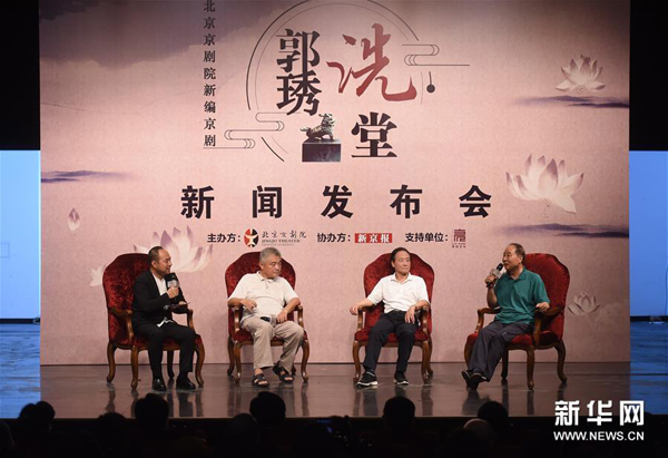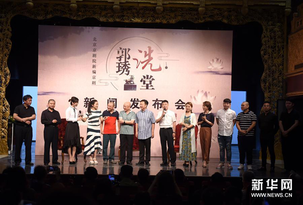 7月4日,京剧《郭琇洗堂》的两组主演团队在发布会上亮相。当日,由北京京剧院主办的《郭琇洗堂》新闻发布会在北京前门天乐园大剧场举行,《郭琇洗堂》是北京京剧院2018年新编的反腐题材京剧。据介绍,《郭琇洗堂》正在紧张的排练中,将于7月25、26、27日在长安大戏院与观众见面。新华社记者 罗晓光 摄 来源: 新华社
