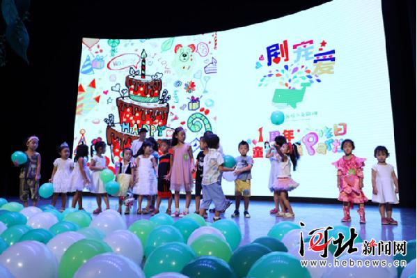 8月19日,石家庄市小鲸鱼·海悦儿童剧场举办一周岁生日party,图为孩子们在舞台上一同为剧场庆祝。