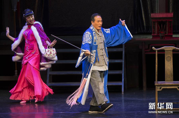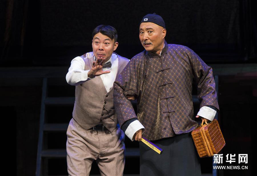 9月9日,在加拿大米西索加市,演员杨立新(右)和徐菁遥在话剧《戏台》中表演。新华社发(邹峥摄)