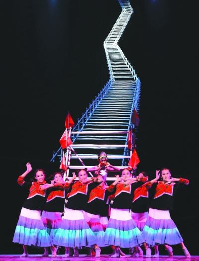 “在‘悬崖村’,唯一与外界联系的藤梯,承载着村民的坚守,也维系着他们的希望。”舞美设计吴宇介绍,剧中的藤梯即是彝族人的“根”,随着剧情推进,藤梯上发出的新芽,也象征着生命和希望,它们贯穿全剧,在与光影的结合中构建出了独特的舞剧意象。同时,查尔瓦御寒,象征彝族生命的火焰和朵乐荷中的黄伞,都是团队亲历后再度放入舞剧创作中的元素。
