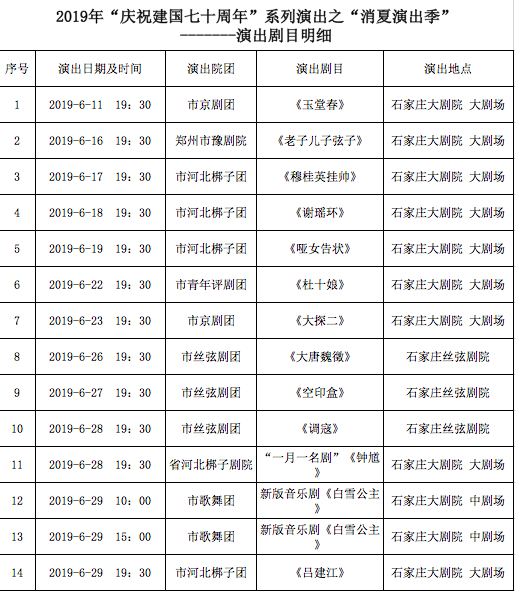 此次系列演出涵盖京剧、评剧、河北梆子、丝弦及音乐剧等多种艺术形式,五个院团三个剧场,共计演出13场次。此次“消夏演出季”的开场戏为6月11日晚由市京剧团特邀北京京剧院优秀青年张派青衣王茜合作演出的《玉堂春》,最后一场为6月29日由市歌舞团演出的新版音乐剧《白雪公主》,还有固定的“一月一名剧”的演出《钟馗》(河北省河北梆子剧院),演出剧目丰富精彩,值得期待。