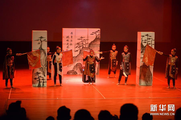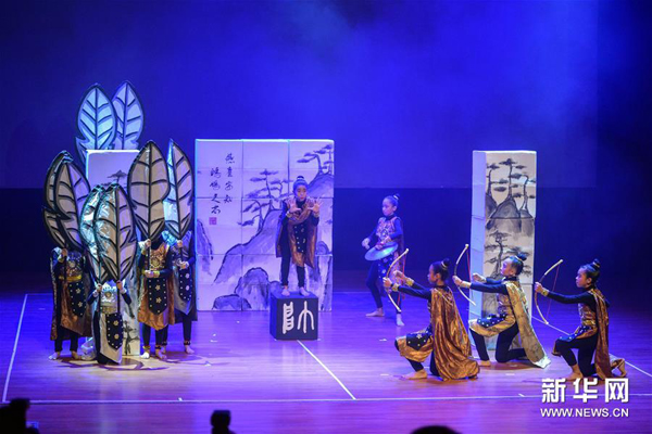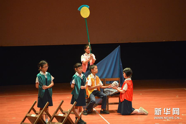 6月15日,在马来西亚吉隆坡,小学生用马来语演绎《三国演义》中的“白帝城托孤”场景。新华社发(张纹综摄)