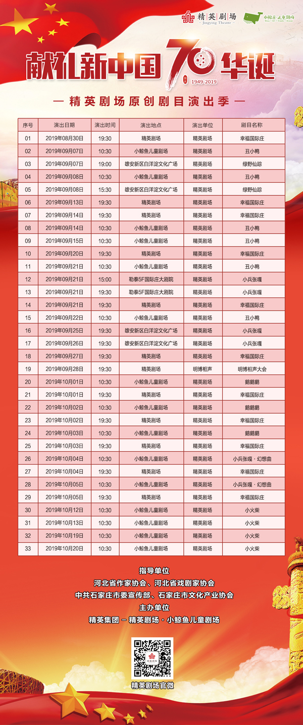据了解,此次演出季由河北省作家协会、河北省戏剧家协会、中共石家庄市委宣传部、石家庄市文化产业协会指导,精英集团-精英剧场·小鲸鱼儿童剧场主办。演出季剧目包括:《幸福国际庄》《小兵张嘎》《小兵张嘎幻想曲》《明博相声大会》等8个原创剧目,将在未来两个月的时间里精彩上演。