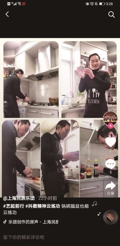 厨房里的锅碗瓢盆也能奏出美妙的音乐?在民乐团的抖音账号里,打击乐演奏家王音睿为乐迷们演奏了一首“厨房协奏曲”,切胡萝卜、打蛋、敲击酱油和醋瓶,统统成了他的灵感来源。笙演奏家赵臻、二胡演奏家丁龙、阮演奏家李霖、王音睿、唢呐演奏家胡晨韵还来了一波炫技接龙,展现在家自学自训的成果。
