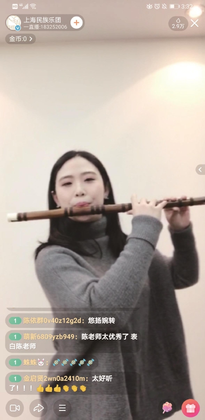 在微博直播平台,三期直播分享活动收获了七万余人次的播放量。丁龙、李胜男、陈昀颖三位演奏家与乐迷聊音乐、谈生活、现场示范演奏,互动踊跃,“再来一首”的弹幕持续不断。乐团抖音账号也推出“唢呐云蹦迪”等形式多样的短视频。接下来,除完成“云上三学”计划外,乐团还将继续推送考级曲目课程、继续进行直播分享活动,不断探寻民族音乐的社会价值和力量。 本报记者 赵玥