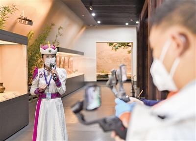 2020年3月7日,内蒙古呼和浩特市昭君博物院金牌讲解员在进行5G文旅直播,让公众足不出户感受“单于和亲”“昭君出塞”的历史文化魅力。丁根厚摄/光明图片