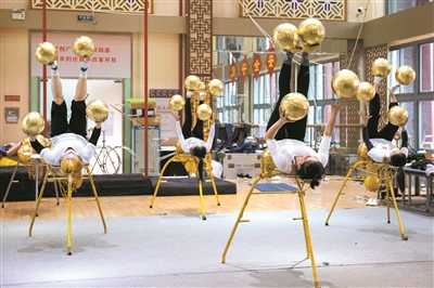 记者走进杂技团排练场时,几位年轻的演员们正在练习球技。金色的圆球在空中飞舞,演员们在练习蹬、抛、传、接等高难度技巧。