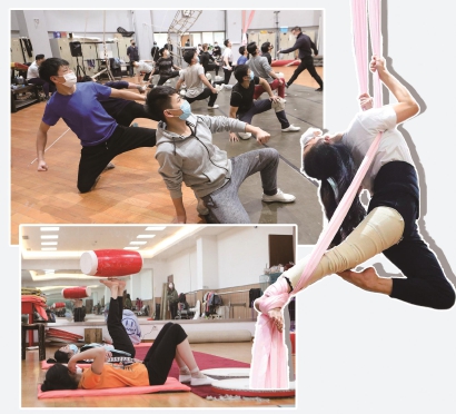 上海杂技团排练空间一派忙碌。如若不是多数演员戴着口罩,恐怕很难意识到这是疫情下没有任何演出安排的文艺院团景象。 摄影:本报记者叶辰亮制图:李洁