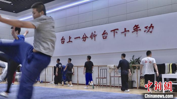 “台上一分钟、台下十年功”,排练厅内醒目的大字时刻提醒着演职员们要刻苦练功,不可懈怠。 康玉湛 摄