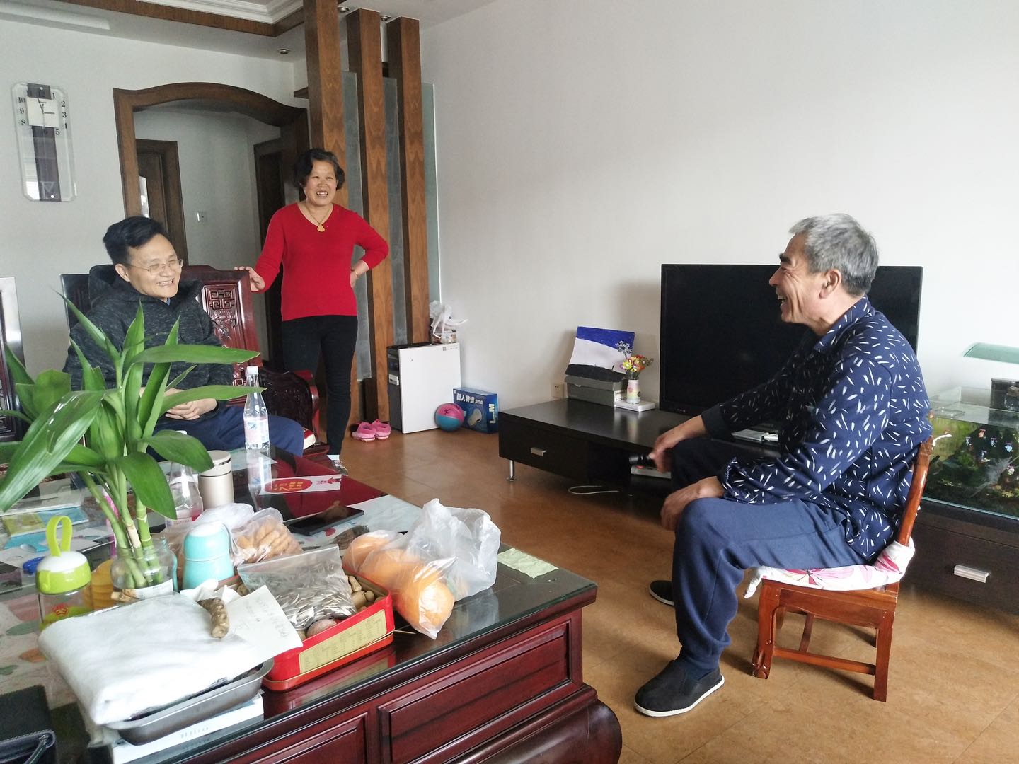 曲艺家李伟建(左一)走进“回天”地区居民家中,谈变化、聊感受。