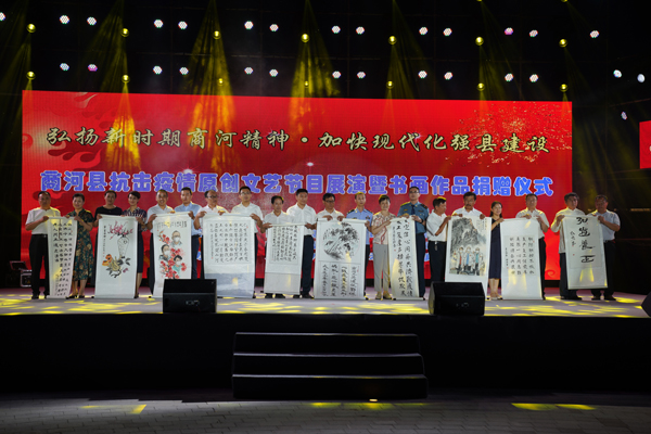 7月16日,山东省商河县抗击疫情原创文艺节目展演暨书画作品捐赠仪式在当地北纬37°康旅示范小镇举行。本次展演由商河县委宣传部主办,县文化和旅游局、县卫生健康局承办。