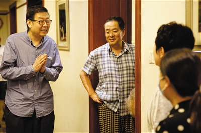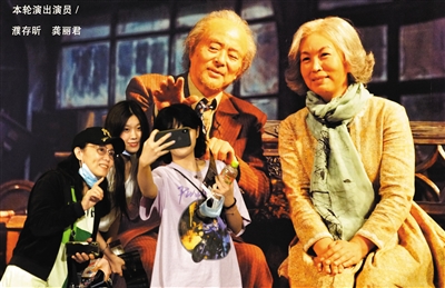 濮存昕、龚丽君演出前候场,北京人民艺术剧院院长任鸣前来后台探望导演和演员。