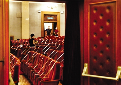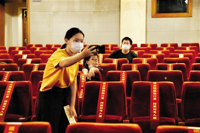 演出前,工作人员在整理座位上的封条。