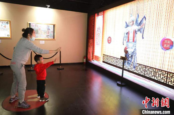 2020(第四届)中国戏曲文化周主场活动在北京园博园落下帷幕。图为“梦入梨园”数字体验展游客互动。北京市丰台区供图