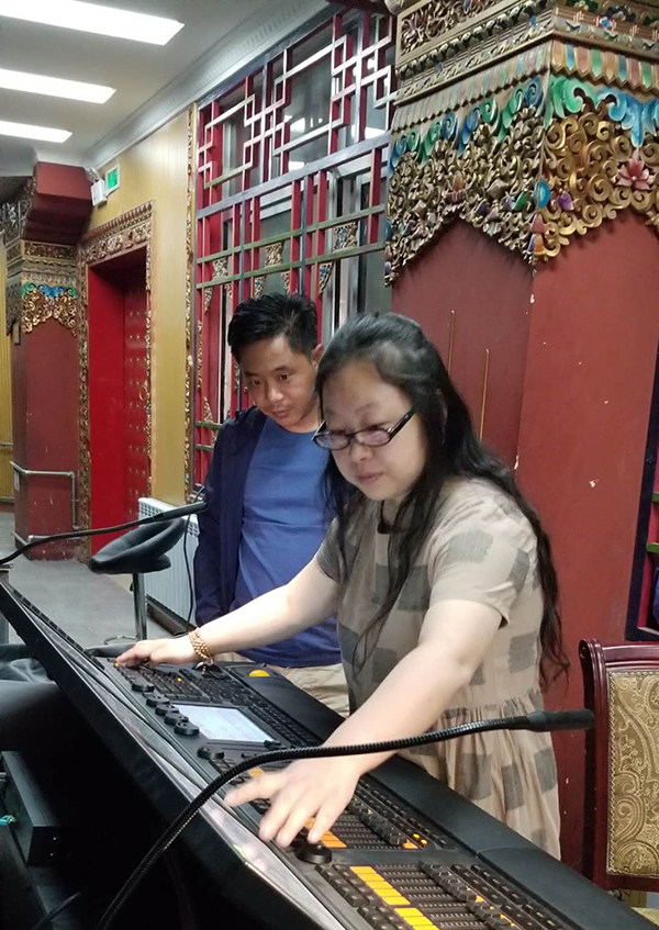 朱丹因材施教,耐心、真诚、细致,旦增学得刻苦认真、一丝不苟。刚开始朱丹嘴里跟念经似地说着控台命令,旦增敲打着控台键盘,他经常敲到脑子缺氧,一片空白,朱丹也经常念到口干舌燥,嗓子发炎,咳嗽不止,出了剧场还满脑子都是控台命令在打转。