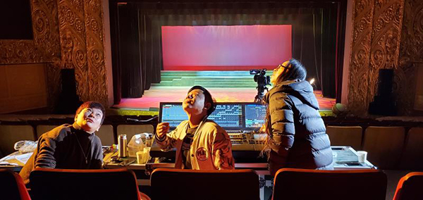 2020年朱丹(右)、旦增(中)、达娃卓玛(左)在《次仁拉姆》演出前,对光编程