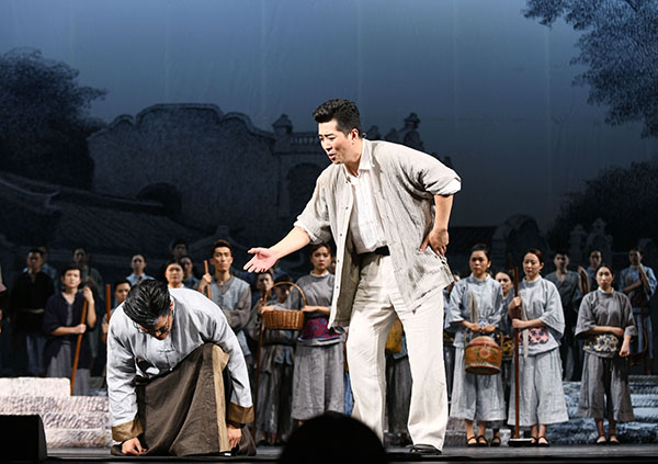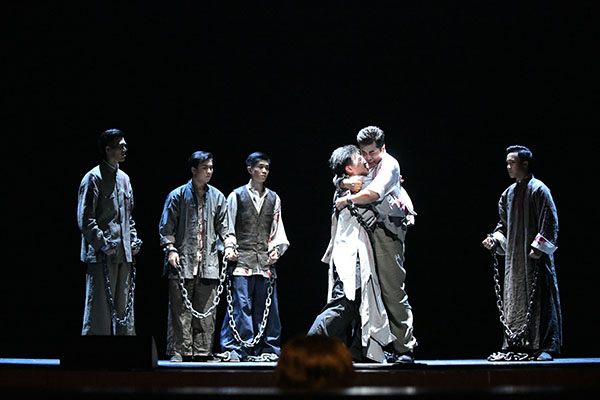 《红流澎湃》精心构筑了戏剧结构,叙事节奏张弛有度。该剧聚焦彭湃领导海陆丰农民运动的几个核心历史事件,以时间为经、人物为纬铺陈展开戏剧情节,采用倒叙方式,通过彭湃在狱中与母亲跨时空回忆为始,渐次引出彭湃辞官、走近农民、烧掉自家的田契还地于民、号召十几万农民加入农会、开展轰轰烈烈的农会运动等历史事件,再现了这位“农民革命大王”传奇而感人的英雄事迹。以戏剧性的故事,为音乐的戏剧性奠定基础,力求做到既有音乐性的戏剧,又有戏剧性的音乐,整体风格追求史诗性、历史性,让今天的观众在符合当代审美的歌剧艺术享受中,感怀当年为了今天的幸福生活,抛头颅洒热血的革命先烈们。