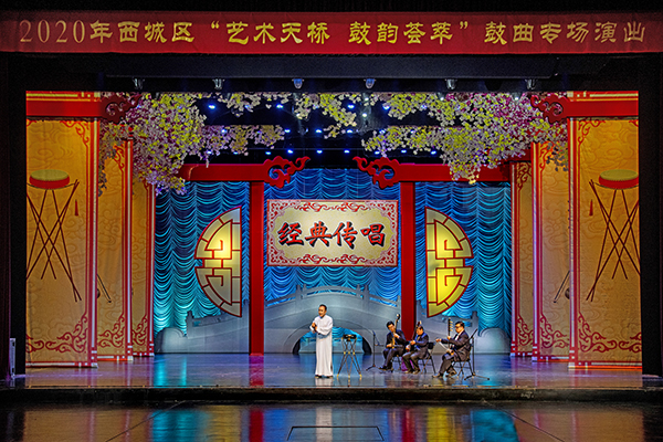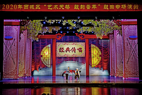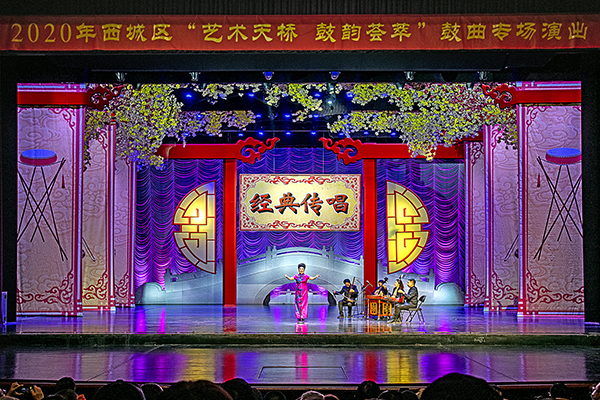 岔曲、天津时调、苏州评弹、北京琴书、单弦……11月9日、10日晚,由北京市西城区文化和旅游局支持、中华曲艺学会指导,西城区第二文化馆主办、西城区百花深处艺术团协办的“艺术天桥·鼓韵荟萃’——2020年“同心抗疫,我们在一起”鼓曲专场演出在北京天桥剧场上演,连续两天的演出让现场观众享受了一场难得的鼓曲盛宴。