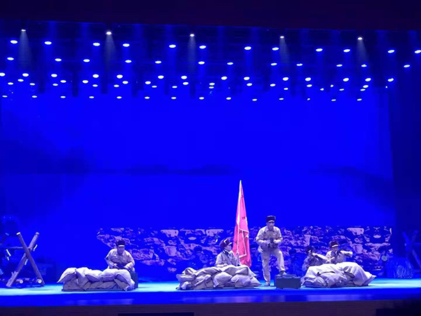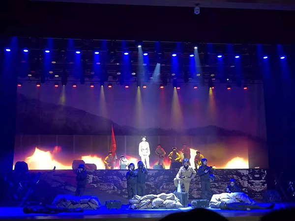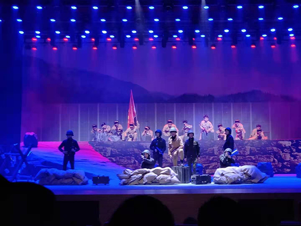 《战旗正红》以抗美援朝战争为背景,讲述了中国人民志愿军红旗五连奔赴朝鲜战场抗美援朝的生动故事,歌颂了中国人民志愿军的革命英雄主义精神。该校影视系师生利用现代舞台效果让现场观众身临其境地感受到中国人民志愿军的伟大。