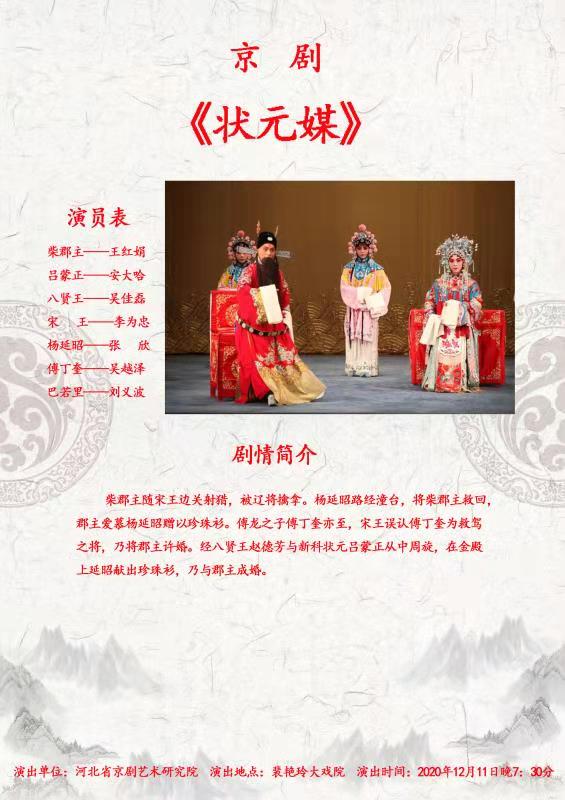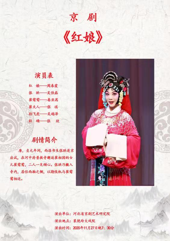 11月27日,由周春霞、吴佳磊、娄亚茜、张琪、吴越泽、张欣等河北名家带来戏曲《红娘》,本剧讲述唐贞元年间,西洛书生张珙进京应试,在河中府普救寺邂逅崔相国的女儿崔莺莺,二人一见倾心。张珙乃搬入寺内,居住西厢之侧,以期俟机与崔莺莺相近……