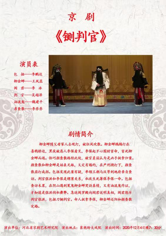 12月4日,李鹏达、王凤蕊、李冰、吴越泽、魏建平、李乔乔等河北名家为观众演绎戏曲《铡判官》,故事讲述柳金蝉随父母家人去观灯,被狂风吹散。柳金蝉踽踽行在喜鹊桥边,黑夜被恶人李保看见,李保起歹心图财害命,害死柳金蝉而逃。恰巧颜查散路经此处,被官差误认为是凶手捉拿归案。包拯发现此案有疑,率领王朝马汉等到地府亲自查访……