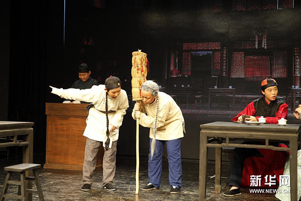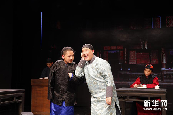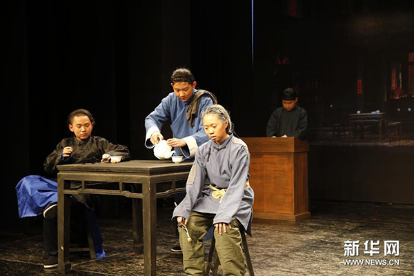 12月12日晚,北京市第五中学分校的学生在表演话剧《茶馆》。新华社发(周良 摄)