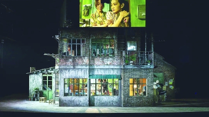 舞台上,一座三层楼高的老旧居民楼拔“地”而起。这座楼不仅可360度无死角旋转展示每个房间,“高精度”还原了上世纪90年代的重庆市井街坊的场景。闪烁的霓虹灯、简陋的小卖部、破碎的张贴画、破旧狭窄的小巷,极力营造了一个昏暗又湿漉漉的环境。更吸睛的是,核心段落采用的“一半是电影,一半是舞台”推进手法——即时影像“直播”被引入舞台,一块屏幕被悬置于“居民楼”上方供观众“审阅”室内剧情。只要人物走进房间,手持摄影师便开始用镜头“说话”,扫过关键道具,紧跟走位,无声地“说”出人物之间的情绪变化和危险关系。最长的一个镜头长达八分钟,高质量的长镜头犹如小电影一般,在舞台上成就了多场精彩的“戏中戏”。