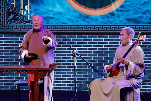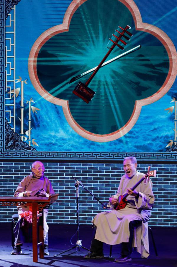 12月7日,在河南艺术中心大剧院,来自宝丰县的艺人余书习(左)表演三弦书《劝闺女》。