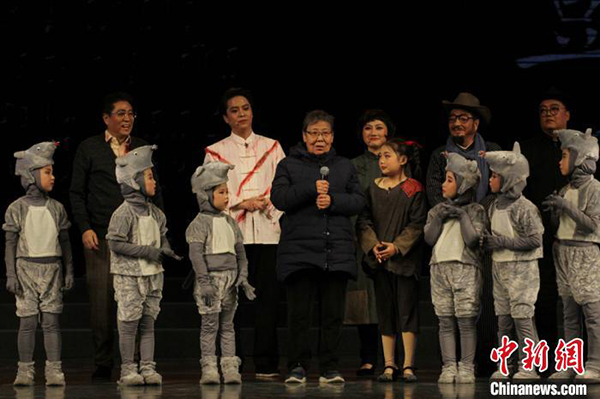 图为81岁高龄的罗立力与儿童剧《大豆谣》演员们同台。 崔琳 摄