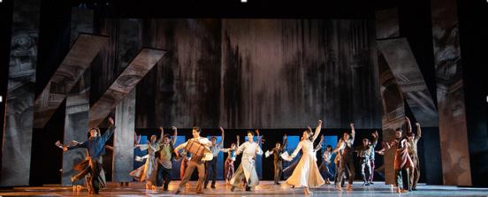 舞剧《岭南秋雨》的故事起始于上世纪二十年代的广州,舞台上灵活排列的悬空条形景片共同组成了那个时局动荡黑云压城的巨幕背景。一身白色西装的复,承载着父母树与若的殷切期盼留洋归来。面对内忧外患的祖国,复毅然加入共产党,与芸等一众满怀壮志的热血青年,成立报社传播先进思想。意气风发的少年们如一道阳光照射进那个暗潮汹涌的时代,他们的热情与坚定随着音乐一同感染着在场的每一位观众。
