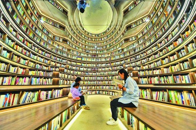 在山东省日照市海边城市书房,市民在阅读书籍。新华社发