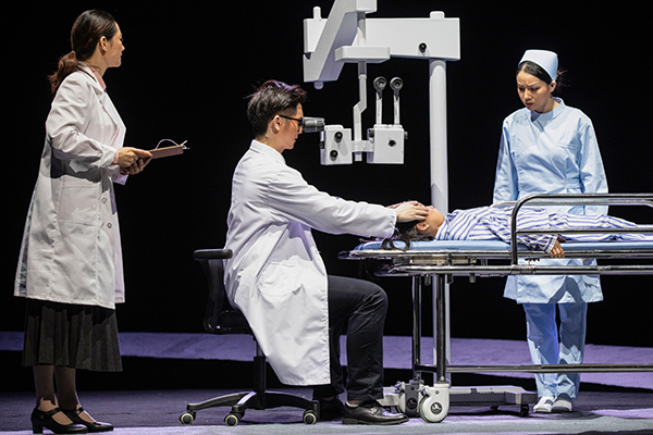 《生命之光》以一台保留内皮角膜移植手术为开场:刚硬的机器在舞台上透现出冷色调,与舞台深处亮起的蓝色光芒呼应;一盏时间提示灯显示“1995年5月20日,星期六”;撕心裂肺的哭喊声、时钟滴答声和心跳声急促响起……这些带有代入感的场景设置,张皇、凄苦、压抑,使观众如置身手术现场,与舞台上人物角色共情,特别是这个场景在剧中反复出现了三次;与此同时,一首儿歌“天上一颗星,地上一个人,星星亮晶晶,就像我的小眼睛,满天都是小星星,挂在天上放光明”响起,同样是反复了三次,使小女孩晶晶渴望光明的愿望不断回荡在剧场里,作深情观照,赋予了情感的温度,更加深了这部舞台剧紧张且有序的艺术感染力。