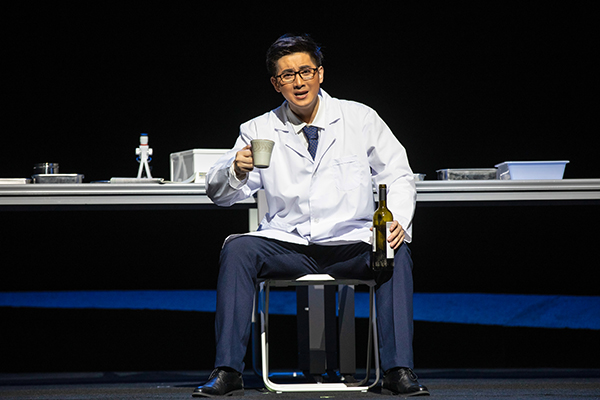 特别是在第四段落“苦克难关”里,俞峰边饮酒边演唱,道尽内心酸苦,可谓酣畅淋漓:“一杯酒,满饮苦涩入咽喉,一败再败好难受。二杯酒,满饮迷茫入咽喉,中途放弃怎能够?三杯酒,满饮焦虑入咽喉,何处良方解我忧?”此时的主人公已经历了三千多次实验的失败,尚未攻克难关,这一大段唱词唱出了一个人历经磨难时的真情实感,能让观众产生强烈的情感共鸣。