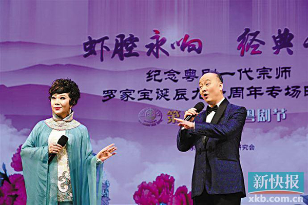 罗家宝创立的虾腔,是当今最流行的粤剧唱腔流派之一,亦是非遗物质文化的瑰宝。这次晚会,登台演唱的一众粤剧粤曲名家和虾腔的传人及爱好者,晚会共推出8个节目,其中两个是曾由罗家宝主演的名剧选段,一是革命现代戏《山乡风云》中一场“访贫问苦”,当年罗家宝以演何奉一角与演女主角刘琴的艺术大师红线女等拍档,深入人心。这次由罗家宝的弟子、粤剧表演艺术家、中国戏剧梅花奖得主梁耀安饰演何奉,粤剧表演艺术家、中国戏剧梅花奖得主崔玉梅饰演刘琴,再加上罗家宝的弟子、国家一级演员郭建华饰演黑牛,粤剧花旦李池湘饰演春花,使这个名剧再发光彩。另一个戏是古装剧《苏小妹三难新郎》的选场,由粤剧表演艺术家卢秋萍主演苏小妹,罗家宝的弟子刘建科则饰演当年由师父主演的新郎秦少游,两人表演都十分到位,演得妙趣横生。