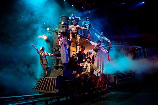 枕木和铁轨搭建出一个环形铁道,1:1仿真制作的火车在舞台上疾驰,游击队员扒火车、抢物资,果敢勇猛,灵活机动……这是大型原创杂技剧《铁道英雄》中“惊、险、奇、绝”的场面。
