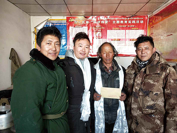 徐腾(左二)为藏区贫困牧民送去慰问金