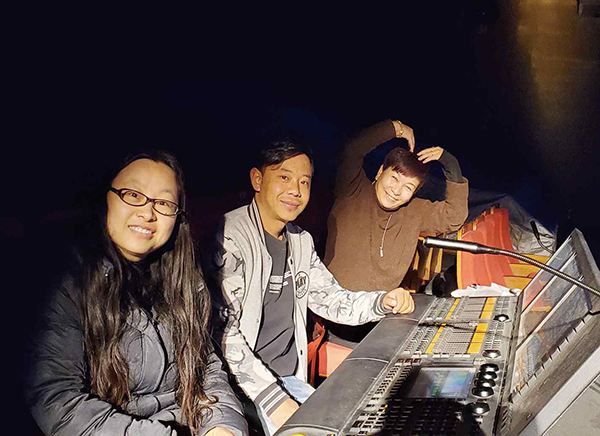 朱丹(左一)和徒弟旦增(中)、藏剧团灯光设计达娃卓玛(右一)在创作中
