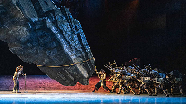 作为一部民族舞剧,《幸福花山》不仅选用传统的苗族民间舞蹈及其动作元素作为主要舞蹈语汇,还根据剧情、人物的需要进行了再编创。剧中,编导通过对苗族民间舞蹈“上挑”动律和“下沉”动律的巧妙编创和运用,在“开山人”行进动作中着重体现“颤膝”动律,形成了步履蹒跚、铿锵顿挫的动作样式。编导放大了舞蹈中上身以腰为轴后倒、前收胯以及前腆腰、后撅臀的动作态势,并在舞段中不断重复,又在重复中加以变化,用来表现开山过程中历尽艰辛却不言放弃的人物形象,粗犷奔放的动作风格,则突出了坚韧不屈的民族性格,富有节奏性、多样性的律动极具感染力。