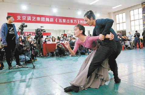 明快的音乐节奏,独具民族特色的舞蹈……昨天(17日),舞剧《五星出东方》仅仅展示了几个舞蹈片段就让在场的观众惊叹不已,舞者和音乐散发的光彩让北京歌剧舞剧院略显简陋的排练厅都显得堂皇起来,更让大家对三个月后的首演充满期待。