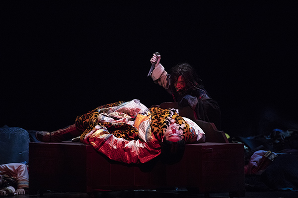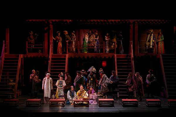 该剧的舞美兼具了普世性和特殊性、真实性和假定性的特点。通过对官寨阶梯行云流水的推拉转换从而架构出不同的戏剧空间:不论是高高在上威严高耸的土司官寨,亦或是位于官寨底部压抑昏暗的银匠陋室,那高耸的阶梯恰似等级秩序的符号,上下阶层的巨大鸿沟赫然显现。不仅如此,多重空间的并存架构把舞台空间最大化利用起来,通过演员自如流畅的表演,从而达到不同空间的穿梭共振。从最开始傻子少爷苏醒的卧室,到傻子少爷与大少爷卧室的并行呈现,再到二层阁楼多重结构并行,舞美设计高广健不断提升舞台空间并行的数量及规模,层层强化舞台空间感的情绪张力,直至最后,象征着土司权利的赫赫官寨轰然毁灭,一切归于平静。高广健以巨大的官寨阶梯作为舞台意象,既保留了原著藏式风情的独特地域特征,又兼具了绝对权利的普适性象征,辅以灯光设计达到对舞台的气氛渲染,从而赋予空间以生命。通过演员的表演,在其整体的视觉呈现中构成一种统一的视觉图像,从而能让观众在“一个整体的共时瞬间”中领会舞台的全部意义,造成极大的戏剧冲突和视觉冲击。