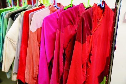 即便追看《白毛女》数十年,很多老剧迷都未必知道,喜儿的红色短衫和白毛女破旧的舞衣看似一衫到底,实则却是有着细微差别的几件。喜儿有同款的四件红色斜门襟短衫,都在右肩处打着补丁,红色却有着从深到浅的区别。上芭团长、第二代“白毛女”辛丽丽说:“喜儿出身贫苦,一件红衣穿好几年,自然会褪色、会变旧,这样设计,是把时光的流逝都浓缩在了舞衣上。”同款四件不过些微色差,挂在一起,仅30秒时间抢妆,却从来不会被拿错。辛丽丽道出窍门:“你看,这件应该是第一场用,红得还很艳;这肯定就是第三场要穿的,喜儿的辫子要别在右胸处,这里密密麻麻的针眼,都是别针留下的。”