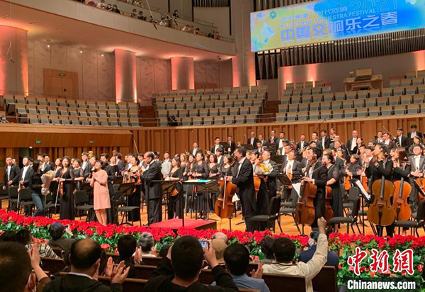 中新网北京5月5日电 (记者 潘旭临)由中国优秀青年作曲家王丹红创作的大型主题交响曲《灯塔》4日晚在国家大剧院音乐厅首演,著名指挥家张国勇携手国内六家交响乐团的140余位演奏者首度联袂,完美展现了《灯塔》的音乐魅力。