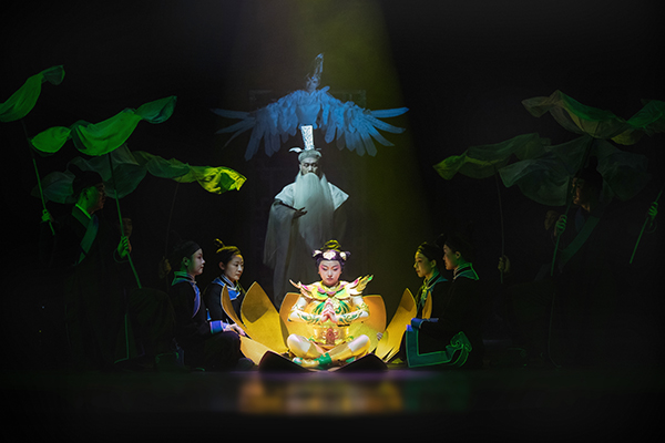 神话故事中的哪吒本领高强,既能跃入九霄,在云雾缭绕的缥缈仙境中学艺习武;又能下至深海,与虾兵蟹将们鏖战七彩龙宫,主创们运用奇思妙想结合传统艺术,带着小观众上天入海、穿云追月,在现实与梦境、当代与神话之间穿梭,演出仅用十四名演员的肢体表演竟达成千军万马之势,以激昂的笔墨书写了一出精彩的小英雄成长史诗!舞台现场也是十分写意的中国风舞美设计,舞台上有五个大型景片,看起来是个空架子,但每一个景片里都设有机关,观众可以直观地看到舞台上的变化,有时影片是一面镜子,又忽然之间会变成一个人,接着人会消失,像魔术一般变化,用创意挑战剧场和表演的极限。
